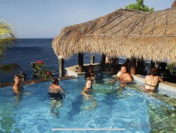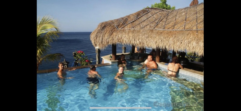 Bazén se sladkou vodou a barem, lehátka na opalování.